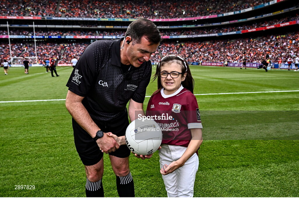 28 July 2024; Caitríona Ní Shé presents the match ball to referee Seán Hurson before the GAA Football All-Ireland Senior Championship Final match between Armagh and Galway at Croke Park in Dublin. Photo by Piaras Ó Mídheach/Sportsfile