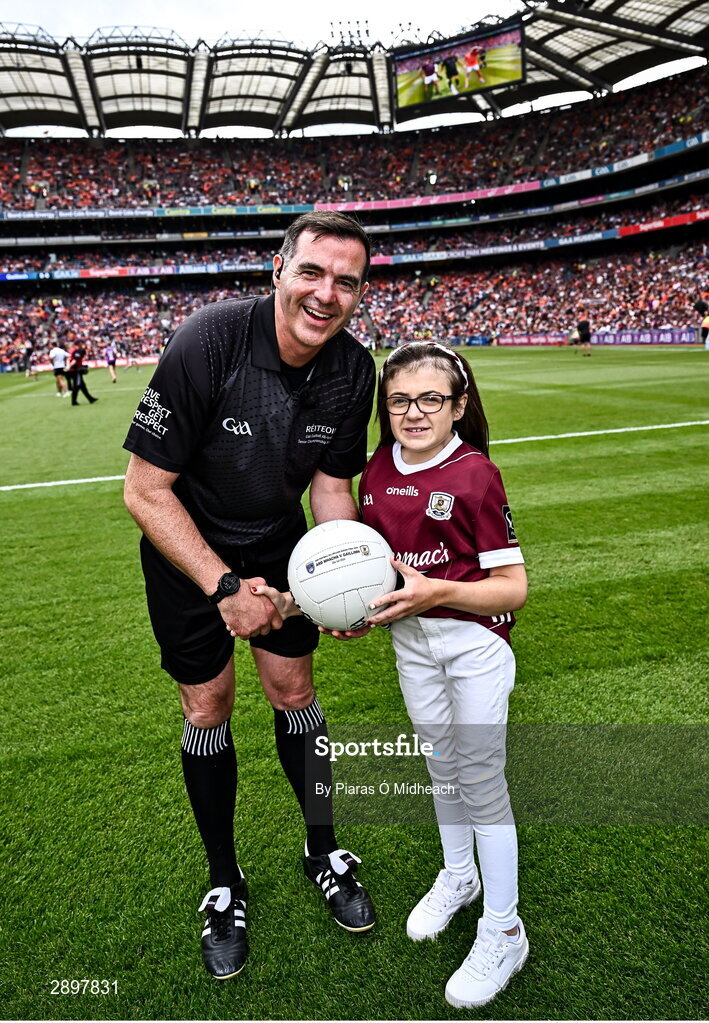 28 July 2024; Caitríona Ní Shé presents the match ball to referee Seán Hurson before the GAA Football All-Ireland Senior Championship Final match between Armagh and Galway at Croke Park in Dublin. Photo by Piaras Ó Mídheach/Sportsfile