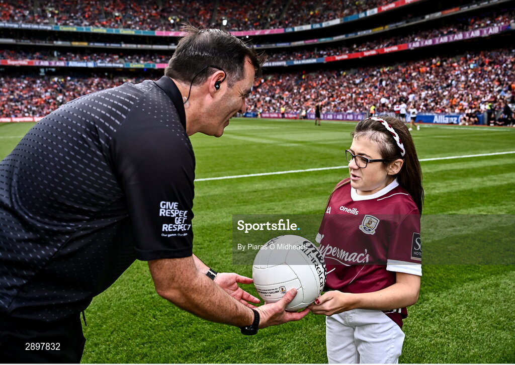 28 July 2024; Caitríona Ní Shé presents the match ball to referee Seán Hurson before the GAA Football All-Ireland Senior Championship Final match between Armagh and Galway at Croke Park in Dublin. Photo by Piaras Ó Mídheach/Sportsfile