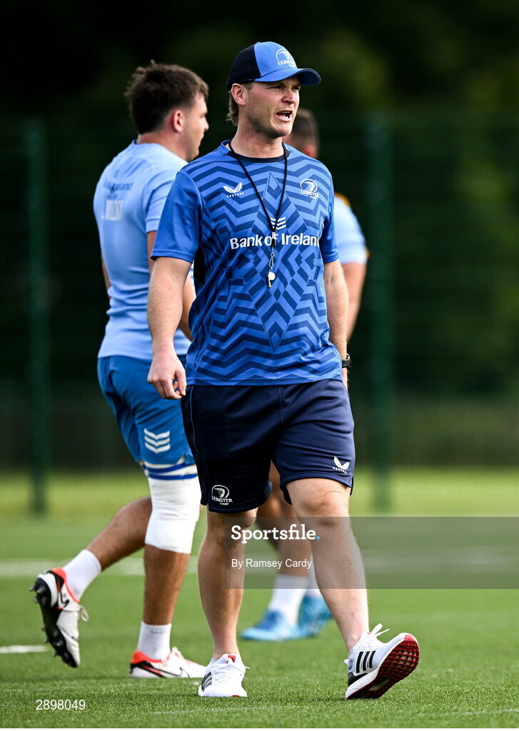 31 July 2024; Assistant coach Tyler Bleyendaal during a Leinster rugby training session at UCD in Dublin. Photo by Ramsey Cardy/Sportsfile