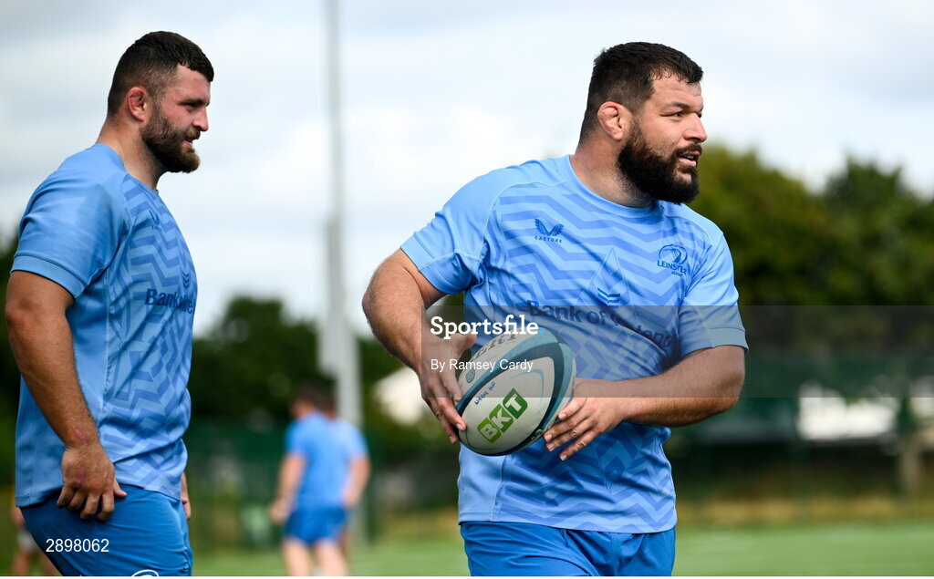 31 July 2024; Rabah Slimani, right, and Michael Milne during a Leinster rugby training session at UCD in Dublin. Photo by Ramsey Cardy/Sportsfile
