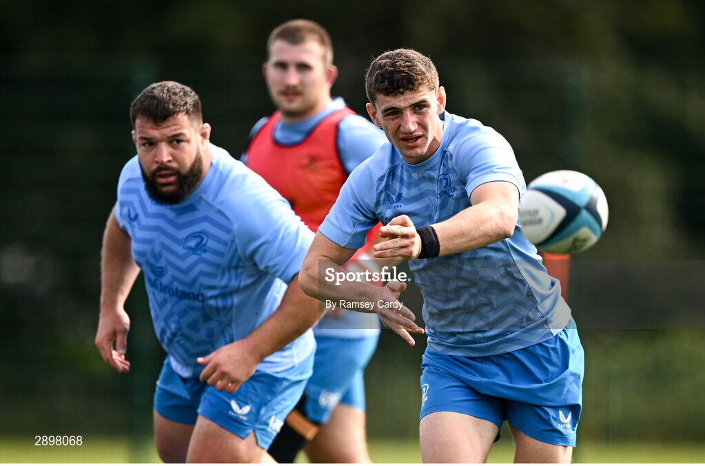 31 July 2024; Cormac Foley, right, and Rabah Slimani during a Leinster rugby training session at UCD in Dublin. Photo by Ramsey Cardy/Sportsfile