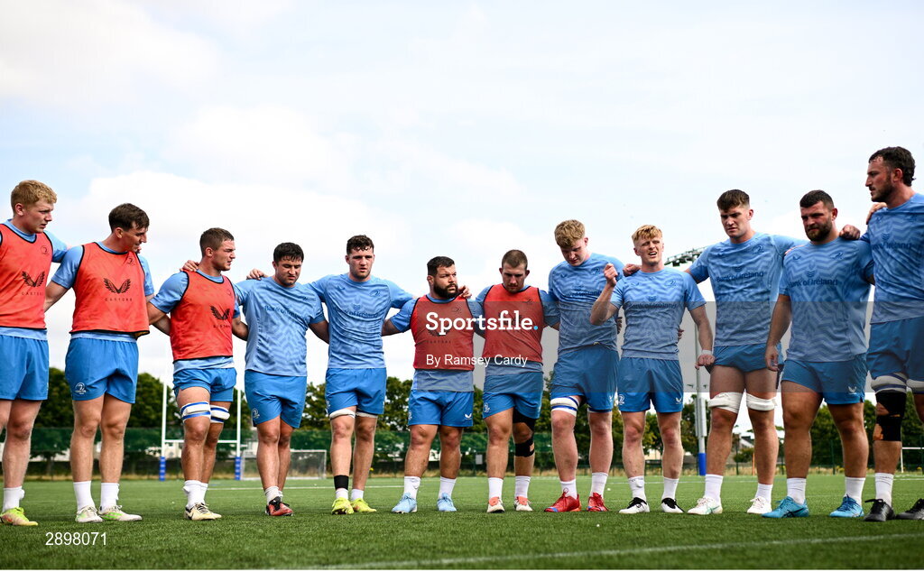 31 July 2024; Players huddle following a Leinster rugby training session at UCD in Dublin. Photo by Ramsey Cardy/Sportsfile