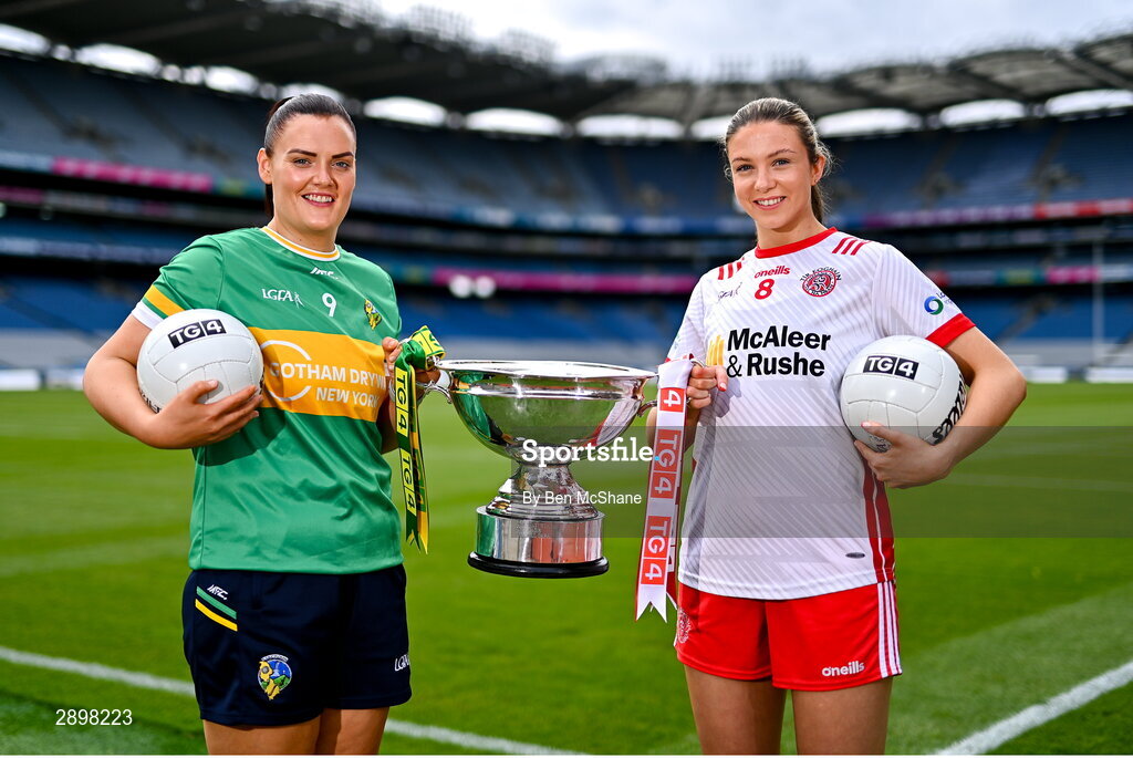 30 July 2024; In attendance during the captains day ahead of the 2024 TG4 All-Ireland Ladies Football Championship Finals at Croke Park in Dublin is Intermediate Championship contenders Leitrim captain Michelle Guckian, left, and Tyrone captain Aoibhinn McHugh. Photo by Ben McShane/Sportsfile