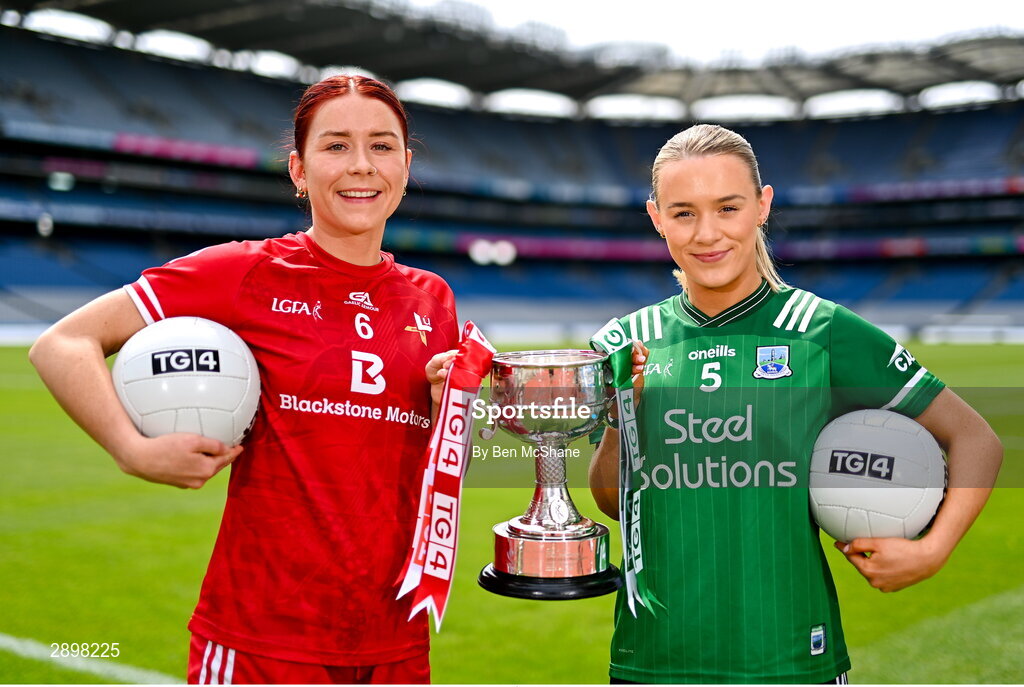 30 July 2024; In attendance during the captains day ahead of the 2024 TG4 All-Ireland Ladies Football Championship Finals at Croke Park in Dublin is Junior Championship contenders Louth captain Áine Breen, left, and Fermanagh captain Shannan McQuade. Photo by Ben McShane/Sportsfile