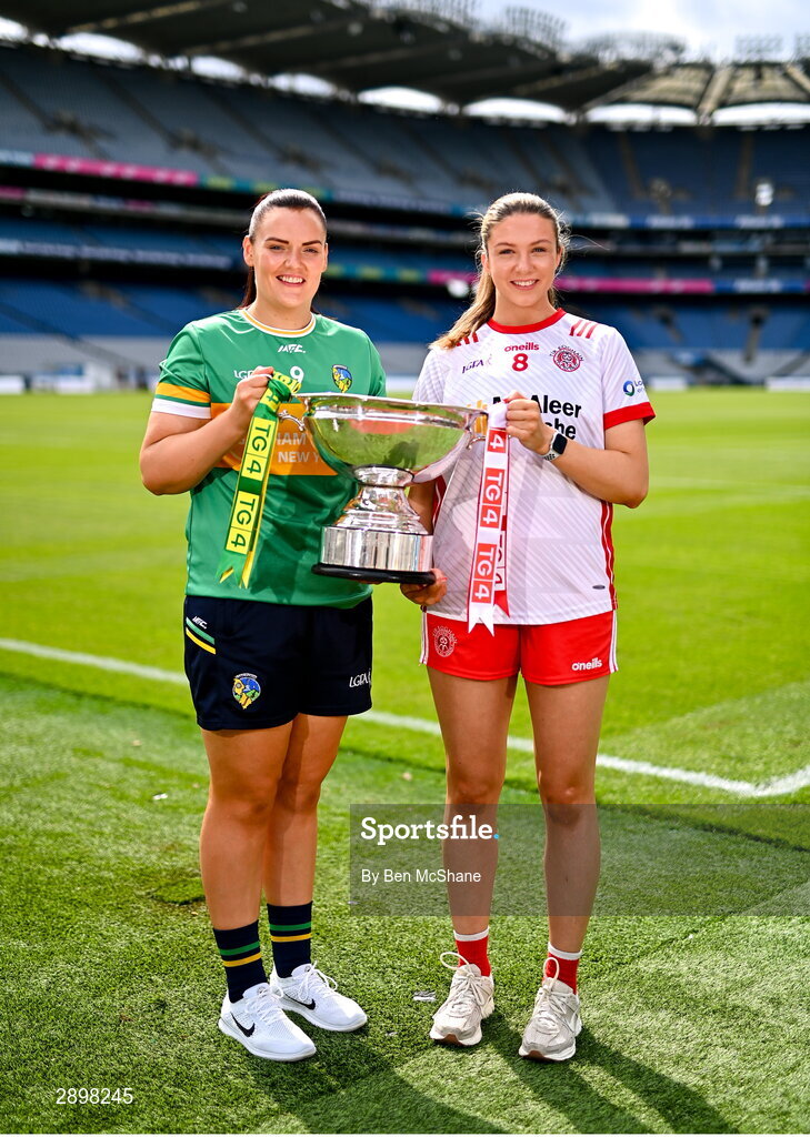 30 July 2024; In attendance during the captains day ahead of the 2024 TG4 All-Ireland Ladies Football Championship Finals at Croke Park in Dublin is the Intermediate Championship contenders Leitrim captain Michelle Guckian, left, and Tyrone captain Aoibhinn McHugh. Photo by Ben McShane/Sportsfile