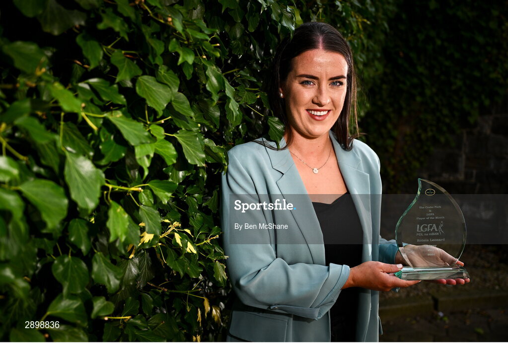 31 July 2024; Galway's Róisín Leonard is pictured with The Croke Park Hotel/LGFA Player of the Month award for July 2024 at The Croke Park Hotel in Jones Road, Dublin. Róisín starred for Galway against Dublin and Cork in the knock-out stages of the TG4 All-Ireland Senior Championship, as the Tribeswomen booked their place in next Sunday’s Final against Kerry at Croke Park. The Corofin player scored 2-3 in the quarter-final victory over Dublin, and 1-5 in the semi-final win against Cork. Photo by Ben McShane/Sportsfile