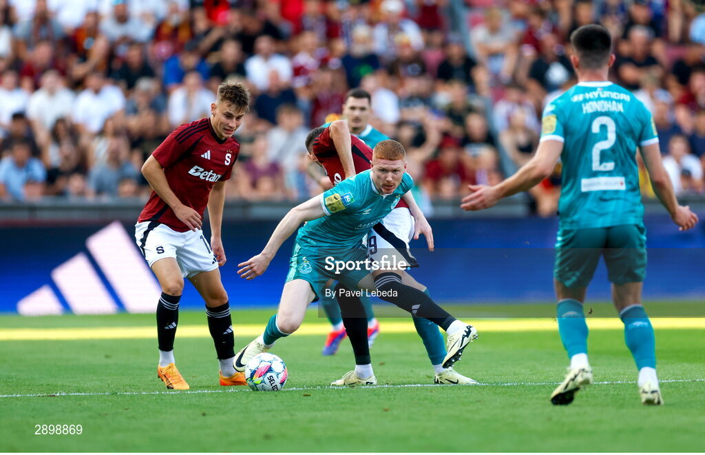 30 July 2024; Darragh Nugent of Shamrock Rovers is tackled by Ermal Krasniqi of Sparta Prague during the UEFA Champions League Second Qualifying Round second leg match between Sparta Prague and Shamrock Rovers at Letná Stadium in Prague, Czechia. Photo by Pavel Lebeda/Sportsfile