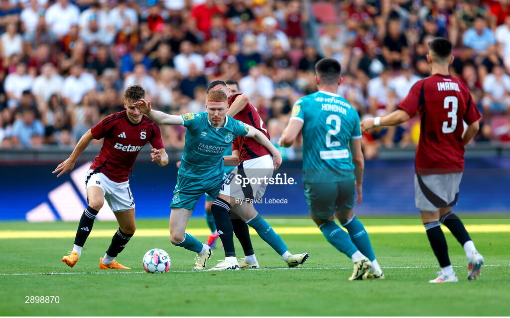 30 July 2024; Darragh Nugent of Shamrock Rovers is tackled by Ermal Krasniqi of Sparta Prague during the UEFA Champions League Second Qualifying Round second leg match between Sparta Prague and Shamrock Rovers at Letná Stadium in Prague, Czechia. Photo by Pavel Lebeda/Sportsfile