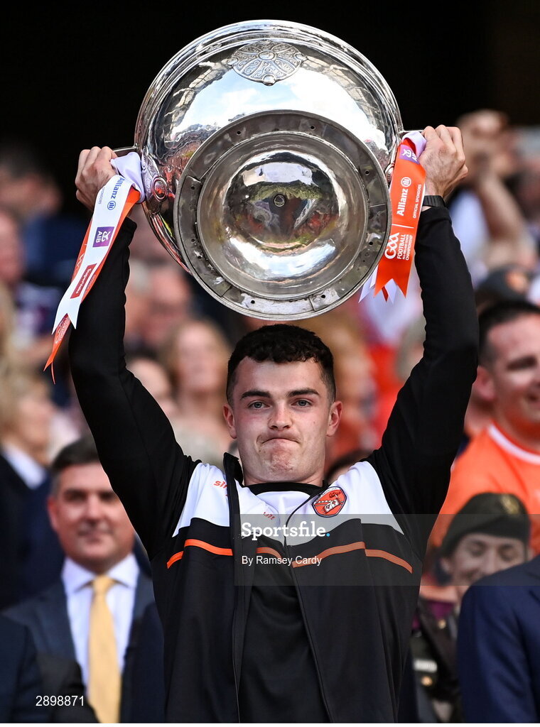 28 July 2024; Conor O'Neill of Armagh lifts the Sam Maguire Cup after the GAA Football All-Ireland Senior Championship Final match between Armagh and Galway at Croke Park in Dublin. Photo by Ramsey Cardy/Sportsfile