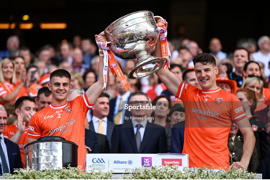 28 July 2024; Darragh McMullan, left, and Niall Grimley of Armagh lift the Sam Maguire Cup after the GAA Football All-Ireland Senior Championship Final match between Armagh and Galway at Croke Park in Dublin. Photo by Ramsey Cardy/Sportsfile
