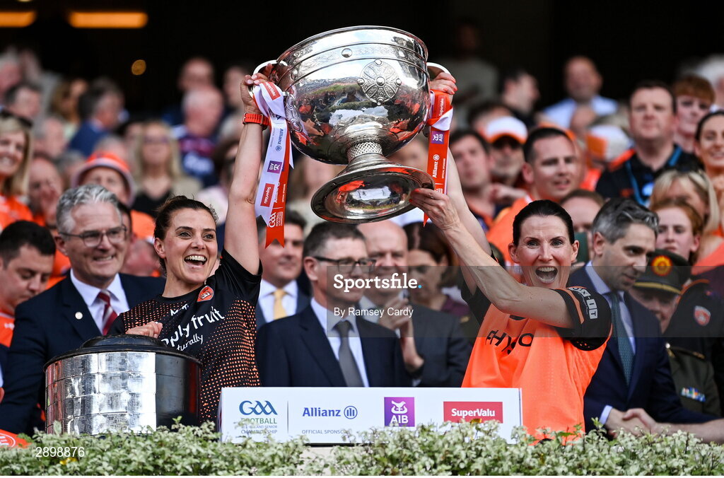 28 July 2024; Armagh strength and conditioning coach Julie Davis, left, and team physiotherapist Maura McGeeney lift the Sam Maguire Cup after the GAA Football All-Ireland Senior Championship Final match between Armagh and Galway at Croke Park in Dublin. Photo by Ramsey Cardy/Sportsfile