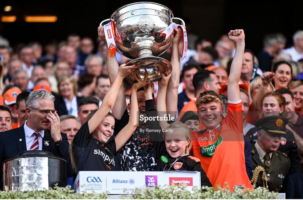 28 July 2024; Armagh goalkeeping coach Ciaran McKinney lifts the Sam Maguire Cup after the GAA Football All-Ireland Senior Championship Final match between Armagh and Galway at Croke Park in Dublin. Photo by Ramsey Cardy/Sportsfile