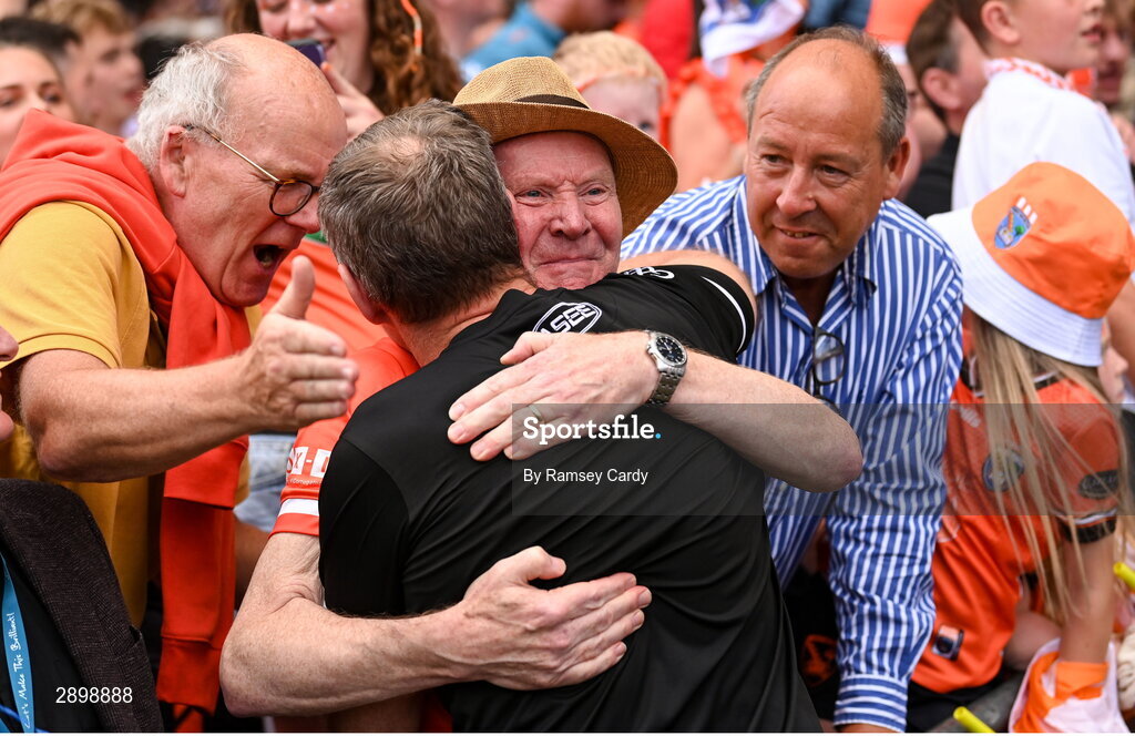 28 July 2024; Paul Duggan, Former Chairperson, Armagh, GAA, and Armagh manager Kieran McGeeney after the GAA Football All-Ireland Senior Championship Final match between Armagh and Galway at Croke Park in Dublin. Photo by Ramsey Cardy/Sportsfile