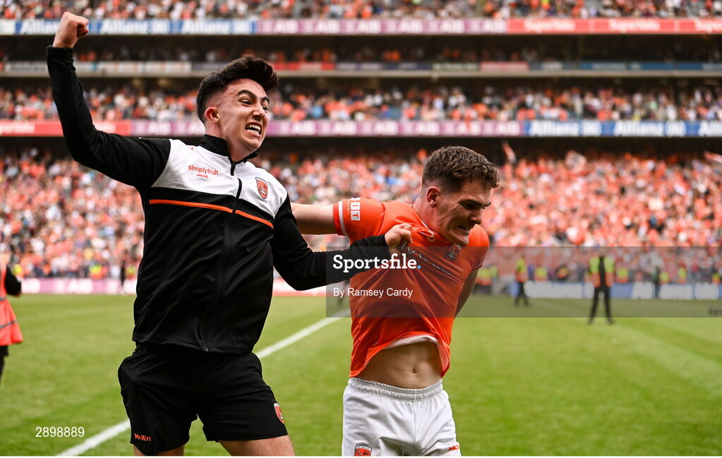 28 July 2024; Sean Conlon, left, and Jarly Óg Burns of Armagh after the GAA Football All-Ireland Senior Championship Final match between Armagh and Galway at Croke Park in Dublin. Photo by Ramsey Cardy/Sportsfile