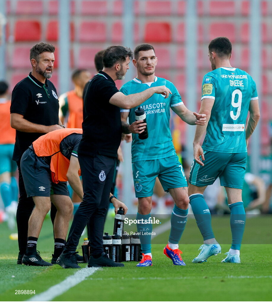 30 July 2024; Trevor Clarke of Shamrock Rovers in conversation with manager Stephen Bradley during the UEFA Champions League Second Qualifying Round second leg match between Sparta Prague and Shamrock Rovers at Letná Stadium in Prague, Czechia. Photo by Pavel Lebeda/Sportsfile