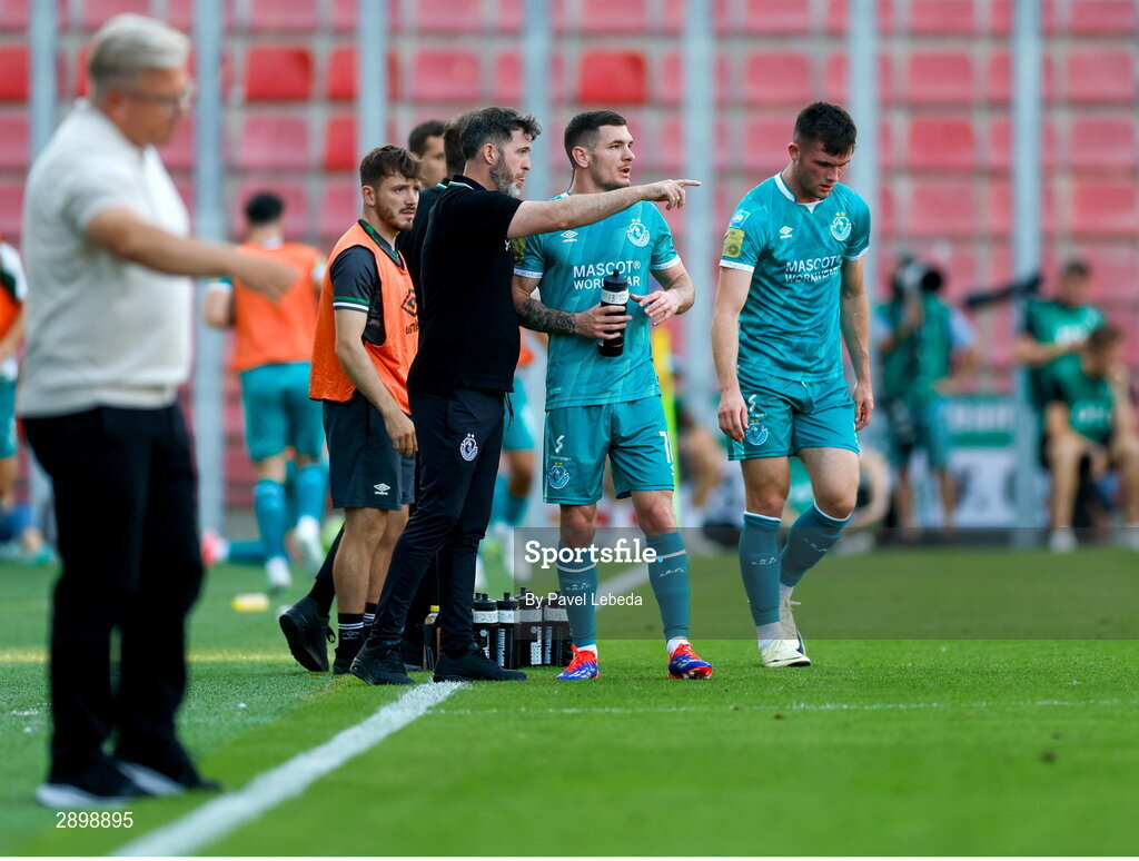30 July 2024; Trevor Clarke of Shamrock Rovers in conversation with manager Stephen Bradley during the UEFA Champions League Second Qualifying Round second leg match between Sparta Prague and Shamrock Rovers at Letná Stadium in Prague, Czechia. Photo by Pavel Lebeda/Sportsfile