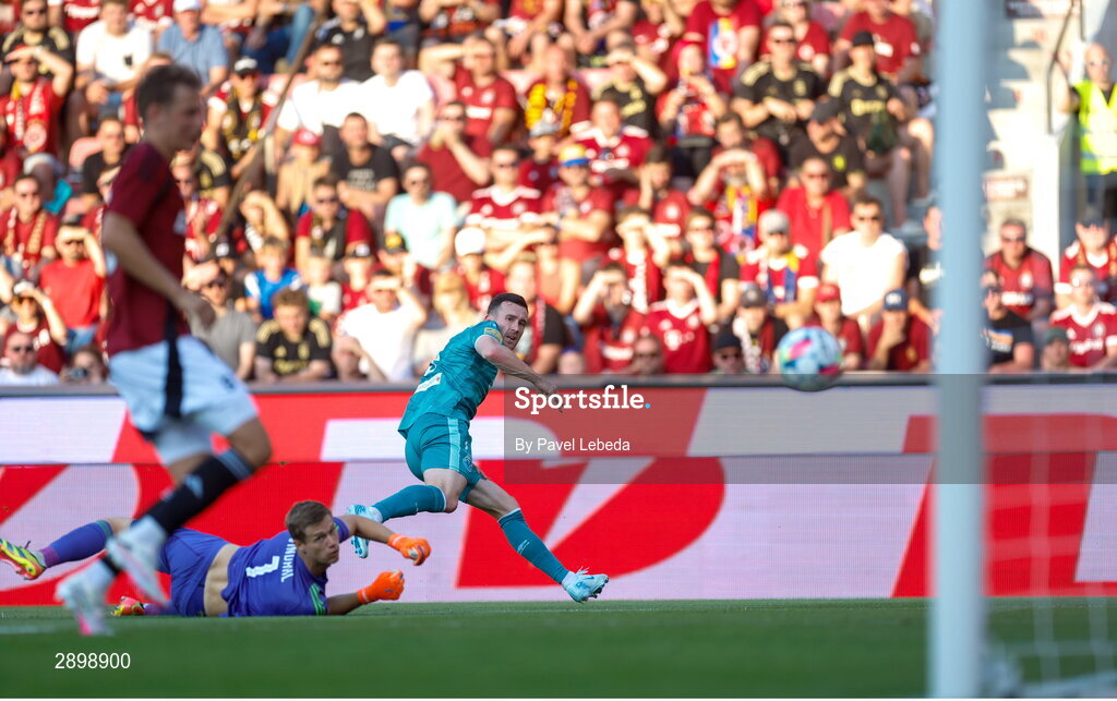 30 July 2024; Aaron Greene of Shamrock Rovers celebrates after scoring his side's first goal during the UEFA Champions League Second Qualifying Round second leg match between Sparta Prague and Shamrock Rovers at Letná Stadium in Prague, Czechia. Photo by Pavel Lebeda/Sportsfile