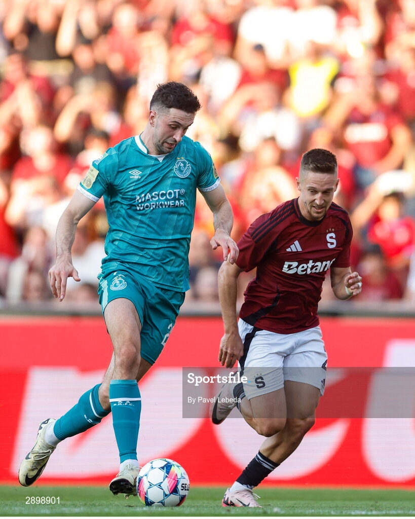 30 July 2024; Aaron Greene of Shamrock Rovers on his way to score his side's first goal during the UEFA Champions League Second Qualifying Round second leg match between Sparta Prague and Shamrock Rovers at Letná Stadium in Prague, Czechia. Photo by Pavel Lebeda/Sportsfile
