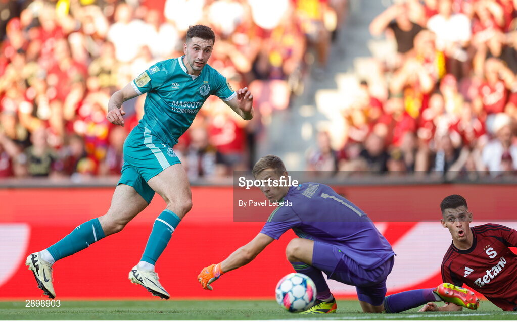 30 July 2024; Neil Farrugia of Shamrock Rovers has a shot on goal during the UEFA Champions League Second Qualifying Round second leg match between Sparta Prague and Shamrock Rovers at Letná Stadium in Prague, Czechia. Photo by Pavel Lebeda/Sportsfile