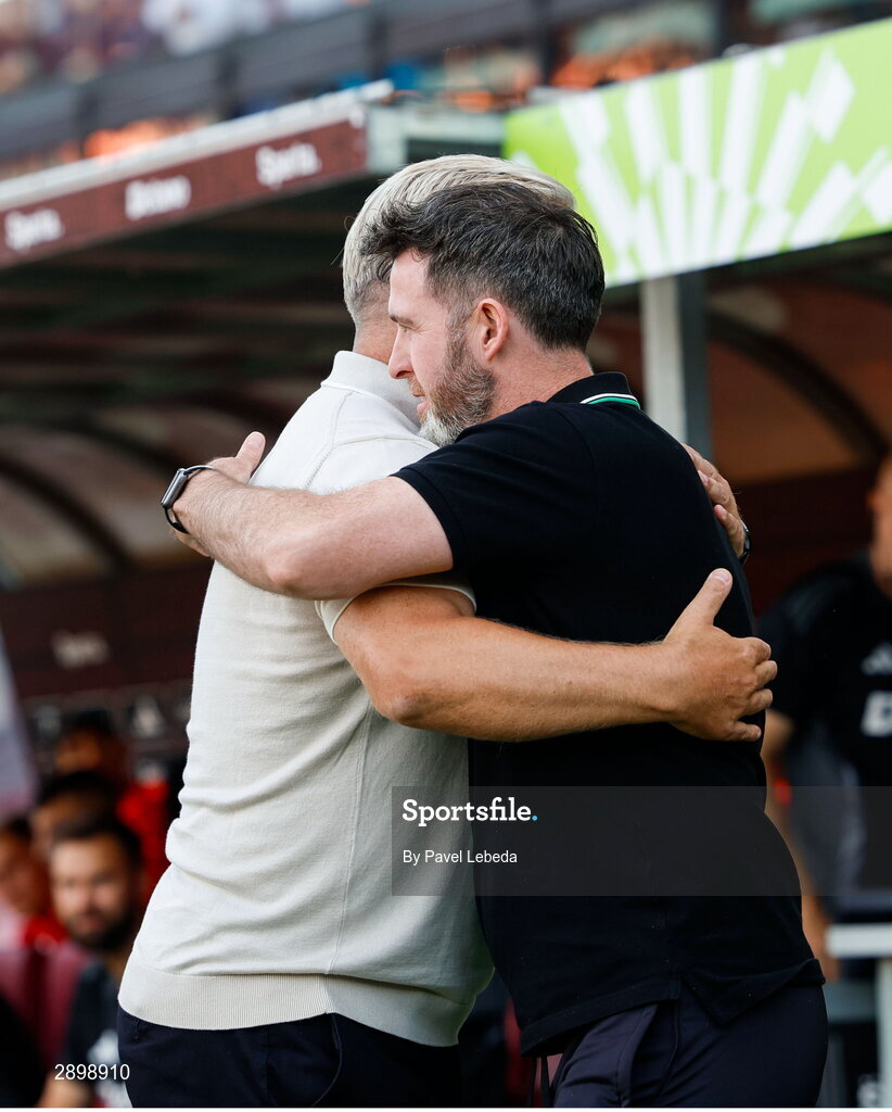 30 July 2024; Shamrock Rovers manager Stephen Bradley, right, is greeted by Sparta Prague manager Lars Friis during the UEFA Champions League Second Qualifying Round second leg match between Sparta Prague and Shamrock Rovers at Letná Stadium in Prague, Czechia. Photo by Pavel Lebeda/Sportsfile