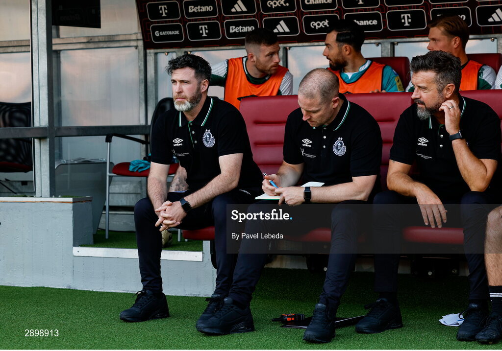 30 July 2024; Shamrock Rovers manager Stephen Bradley, left, with assistant coach Glenn Cronin and sporting director Stephen McPhail, before the UEFA Champions League Second Qualifying Round second leg match between Sparta Prague and Shamrock Rovers at Letná Stadium in Prague, Czechia. Photo by Pavel Lebeda/Sportsfile