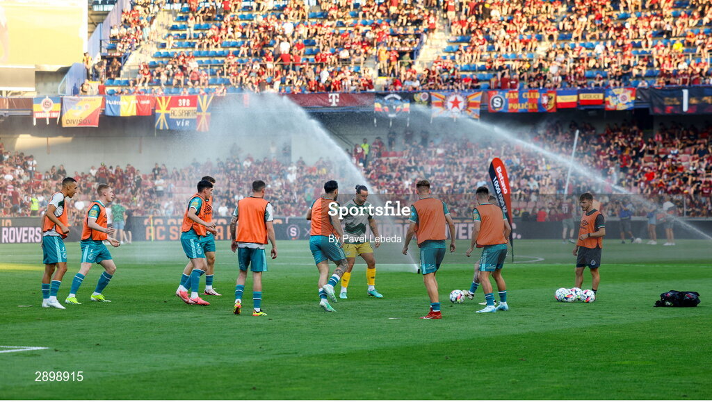 30 July 2024; Shamrock Rovers players warm up before the UEFA Champions League Second Qualifying Round second leg match between Sparta Prague and Shamrock Rovers at Letná Stadium in Prague, Czechia. Photo by Pavel Lebeda/Sportsfile
