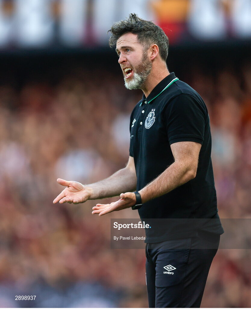 30 July 2024; Shamrock Rovers manager Stephen Bradley reacts during the UEFA Champions League Second Qualifying Round second leg match between Sparta Prague and Shamrock Rovers at Letná Stadium in Prague, Czechia. Photo by Pavel Lebeda/Sportsfile