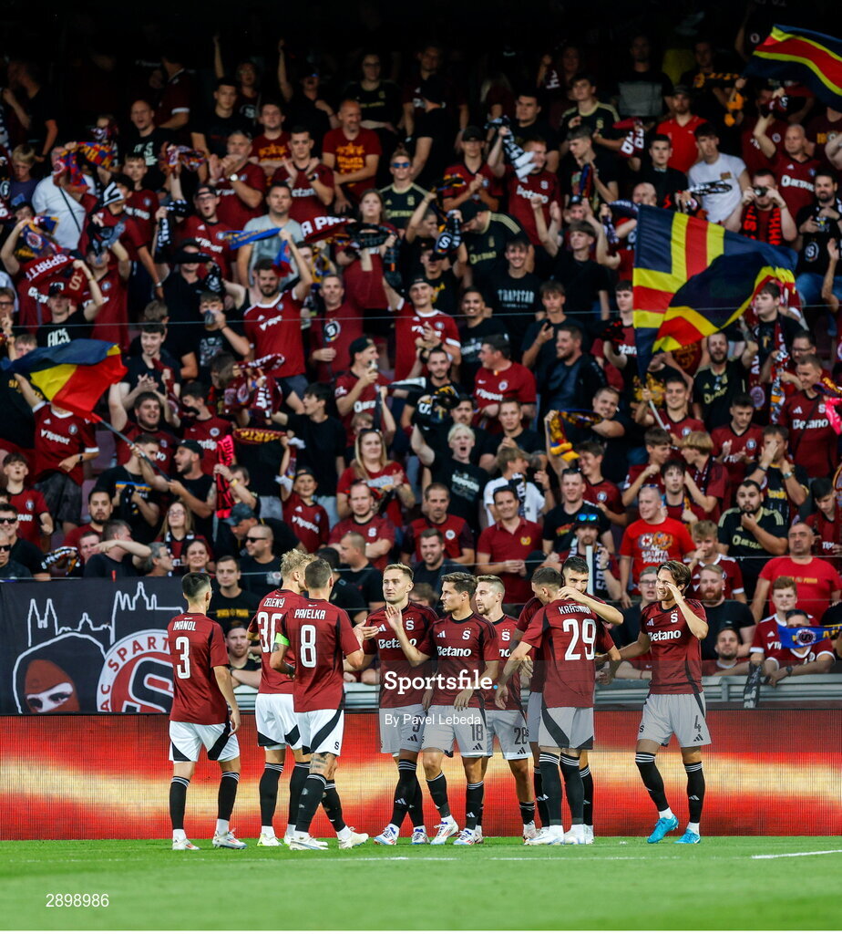 30 July 2024; Sparta Prague players celebrate after their teammate Indrit Tuci score their side's fourth goal during the UEFA Champions League Second Qualifying Round second leg match between Sparta Prague and Shamrock Rovers at Letná Stadium in Prague, Czechia. Photo by Pavel Lebeda/Sportsfile