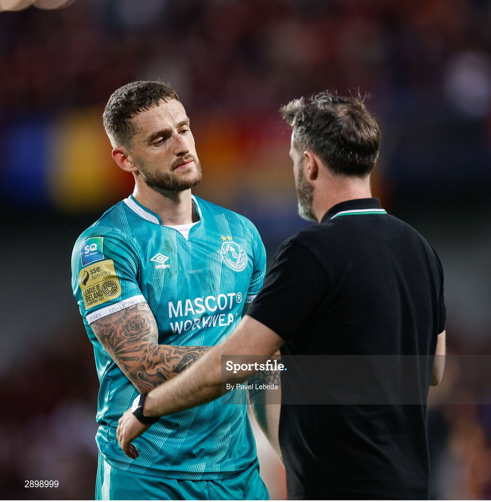 30 July 2024; Lee Grace of Shamrock Rovers shakes hands with manager Stephen Bradley after their side's defeat in the UEFA Champions League Second Qualifying Round second leg match between Sparta Prague and Shamrock Rovers at Letná Stadium in Prague, Czechia. Photo by Pavel Lebeda/Sportsfile