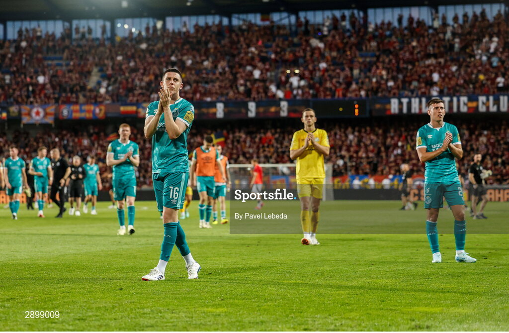 30 July 2024; Shamrock Rovers players, including Gary O'Neill, 16, acknowledge supporters after their side's defeat in the UEFA Champions League Second Qualifying Round second leg match between Sparta Prague and Shamrock Rovers at Letná Stadium in Prague, Czechia. Photo by Pavel Lebeda/Sportsfile