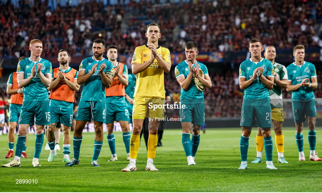 30 July 2024; Shamrock Rovers players acknowledge supporters after their side's defeat in the UEFA Champions League Second Qualifying Round second leg match between Sparta Prague and Shamrock Rovers at Letná Stadium in Prague, Czechia. Photo by Pavel Lebeda/Sportsfile