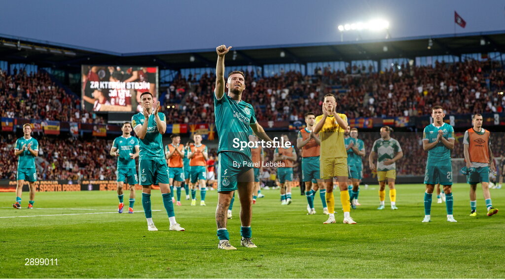 30 July 2024; Shamrock Rovers players acknowledge supporters after their side's defeat in the UEFA Champions League Second Qualifying Round second leg match between Sparta Prague and Shamrock Rovers at Letná Stadium in Prague, Czechia. Photo by Pavel Lebeda/Sportsfile