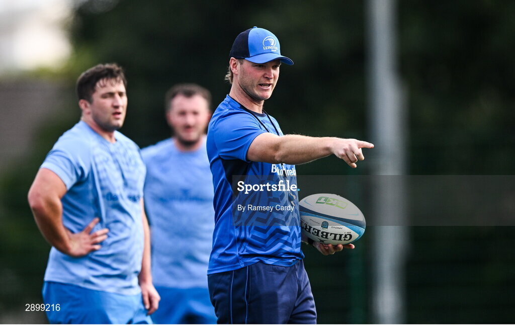 31 July 2024; Assistant coach Tyler Bleyendaal during a Leinster rugby training session at UCD in Dublin. Photo by Ramsey Cardy/Sportsfile