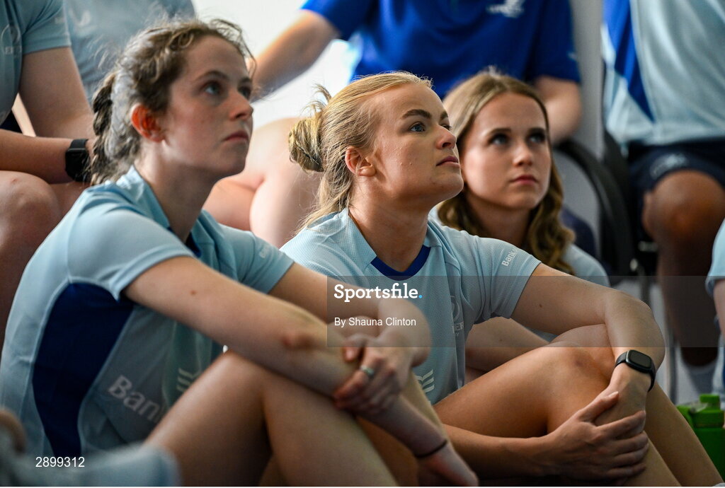 30 July 2024; Erin McConnell, centre, during Leinster rugby women's season launch at Energia Park in Dublin. Photo by Shauna Clinton/Sportsfile