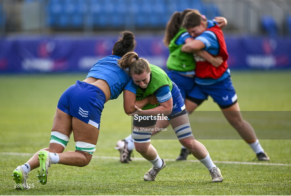 30 July 2024; Eimear Corri, left, and Molly Boyne during Leinster rugby women's season launch at Energia Park in Dublin. Photo by Shauna Clinton/Sportsfile