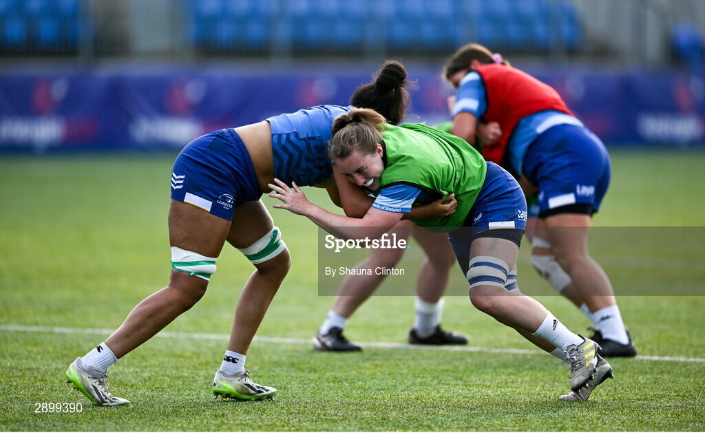 30 July 2024; Eimear Corri, left, and Molly Boyne during Leinster rugby women's season launch at Energia Park in Dublin. Photo by Shauna Clinton/Sportsfile