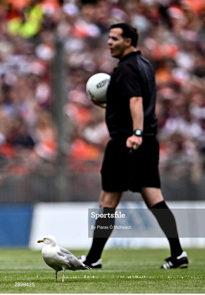 28 July 2024; A seagull in the middle of the pitch as referee Seán Hurson prepares to throw the ball in to start the GAA Football All-Ireland Senior Championship Final match between Armagh and Galway at Croke Park in Dublin. Photo by Piaras Ó Mídheach/Sportsfile