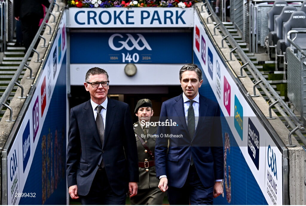 28 July 2024; An Taoiseach Simon Harris TD and Ard Stiúrthóir of the GAA Tom Ryan, left, at the GAA Football All-Ireland Senior Championship Final match between Armagh and Galway at Croke Park in Dublin. Photo by Piaras Ó Mídheach/Sportsfile