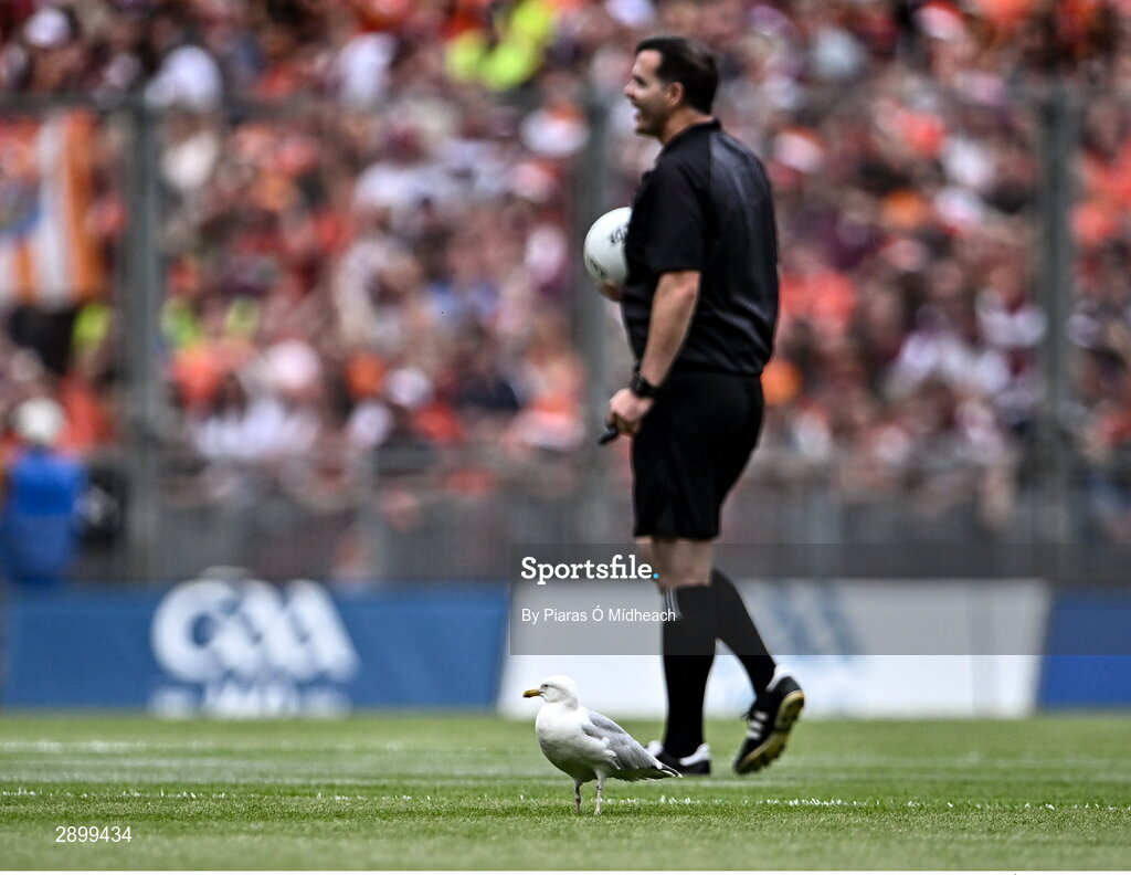 28 July 2024; A seagull in the middle of the pitch as referee Seán Hurson prepares to throw the ball in to start the GAA Football All-Ireland Senior Championship Final match between Armagh and Galway at Croke Park in Dublin. Photo by Piaras Ó Mídheach/Sportsfile