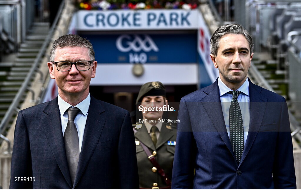 28 July 2024; An Taoiseach Simon Harris TD and Ard Stiúrthóir of the GAA Tom Ryan, left, at the GAA Football All-Ireland Senior Championship Final match between Armagh and Galway at Croke Park in Dublin. Photo by Piaras Ó Mídheach/Sportsfile