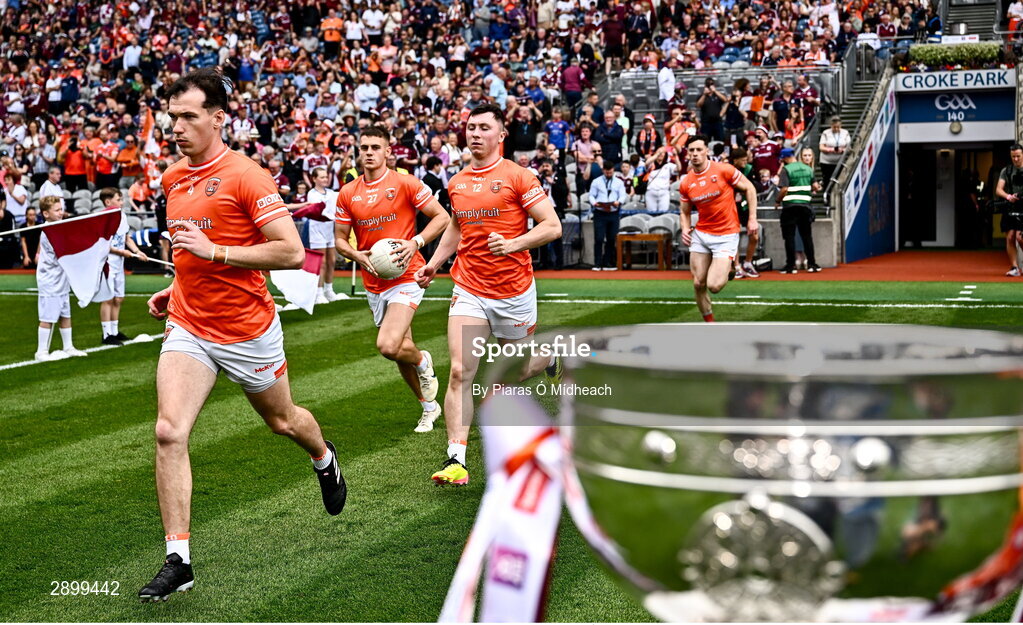 28 July 2024; Armagh players, including Barry McCambridge, left, run onto the pitch past the Sam Maguire Cup before the GAA Football All-Ireland Senior Championship Final match between Armagh and Galway at Croke Park in Dublin. Photo by Piaras Ó Mídheach/Sportsfile
