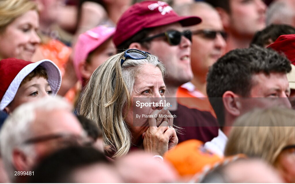 28 July 2024; A supporter crosses her fingers during the GAA Football All-Ireland Senior Championship Final match between Armagh and Galway at Croke Park in Dublin. Photo by Piaras Ó Mídheach/Sportsfile