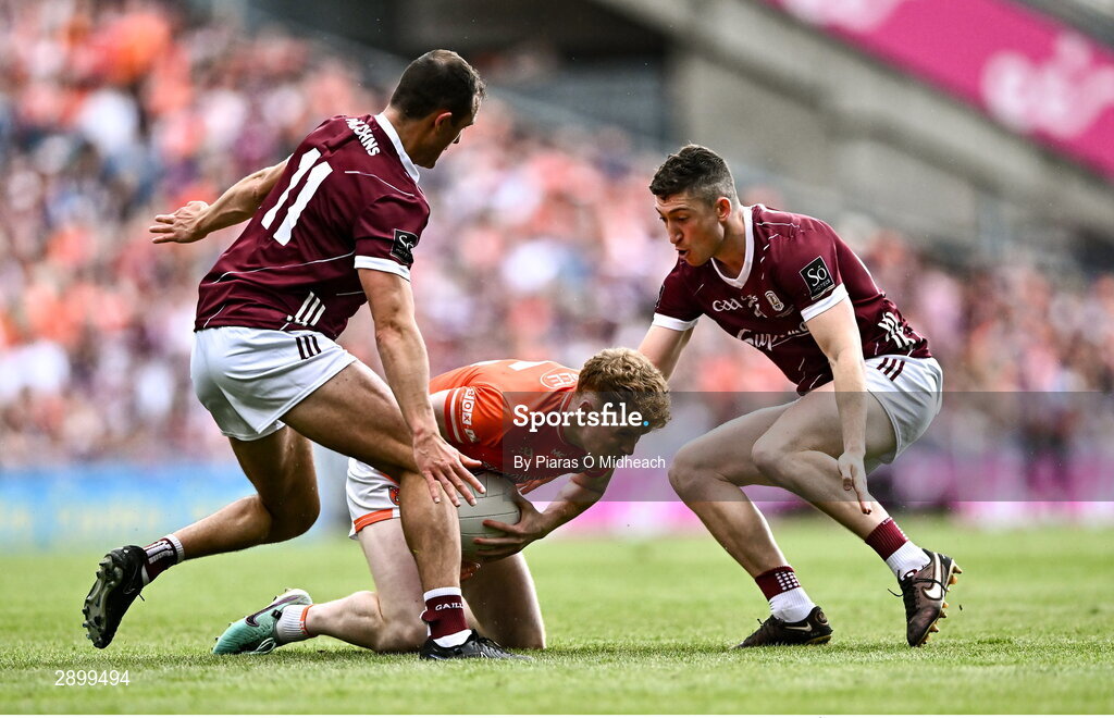28 July 2024; Conor Turbitt of Armagh in action against John Maher, left, and Johnny Heaney of Galway during the GAA Football All-Ireland Senior Championship Final match between Armagh and Galway at Croke Park in Dublin. Photo by Piaras Ó Mídheach/Sportsfile