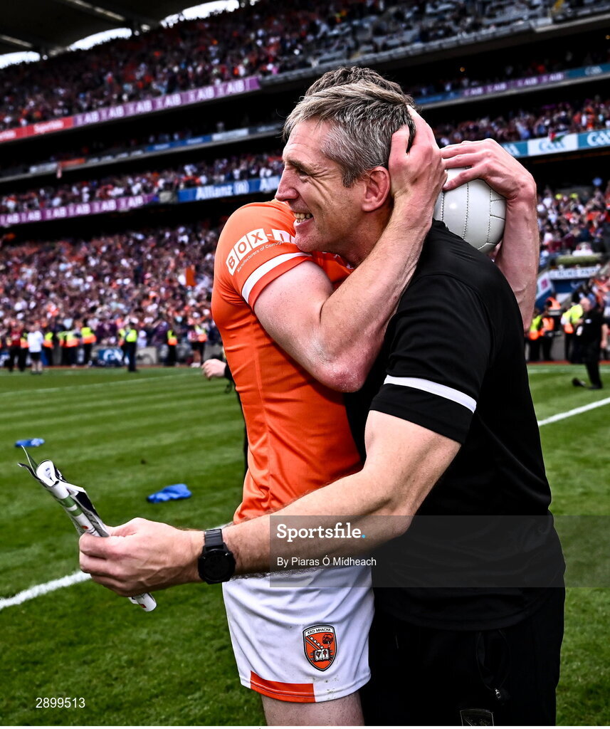28 July 2024; Armagh manager Kieran McGeeney celebrates with Jarly Óg Burns after their side's victory in the GAA Football All-Ireland Senior Championship Final match between Armagh and Galway at Croke Park in Dublin. Photo by Piaras Ó Mídheach/Sportsfile