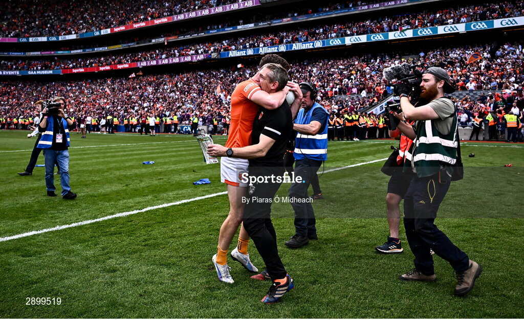 28 July 2024; Armagh manager Kieran McGeeney celebrates with Jarly Óg Burns after their side's victory in the GAA Football All-Ireland Senior Championship Final match between Armagh and Galway at Croke Park in Dublin. Photo by Piaras Ó Mídheach/Sportsfile