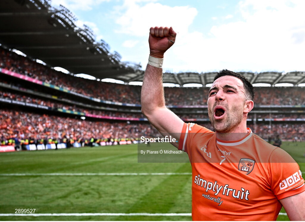 28 July 2024; Armagh captain Aidan Forker celebrates after his side's victory in the GAA Football All-Ireland Senior Championship Final match between Armagh and Galway at Croke Park in Dublin. Photo by Piaras Ó Mídheach/Sportsfile
