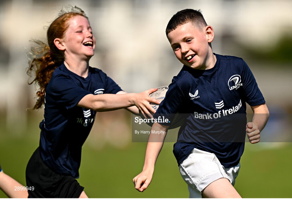 31 July 2024; Ben Brady, right, and Anna Redmond during the Bank of Ireland Leinster Rugby Summer Camp at St Mary's College RFC in Dublin. Photo by Harry Murphy/Sportsfile