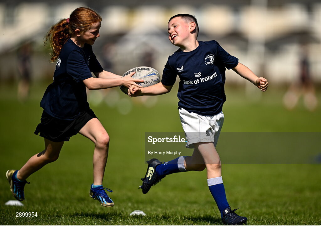 31 July 2024; Ben Brady, right, and Anna Redmond during the Bank of Ireland Leinster Rugby Summer Camp at St Mary's College RFC in Dublin. Photo by Harry Murphy/Sportsfile