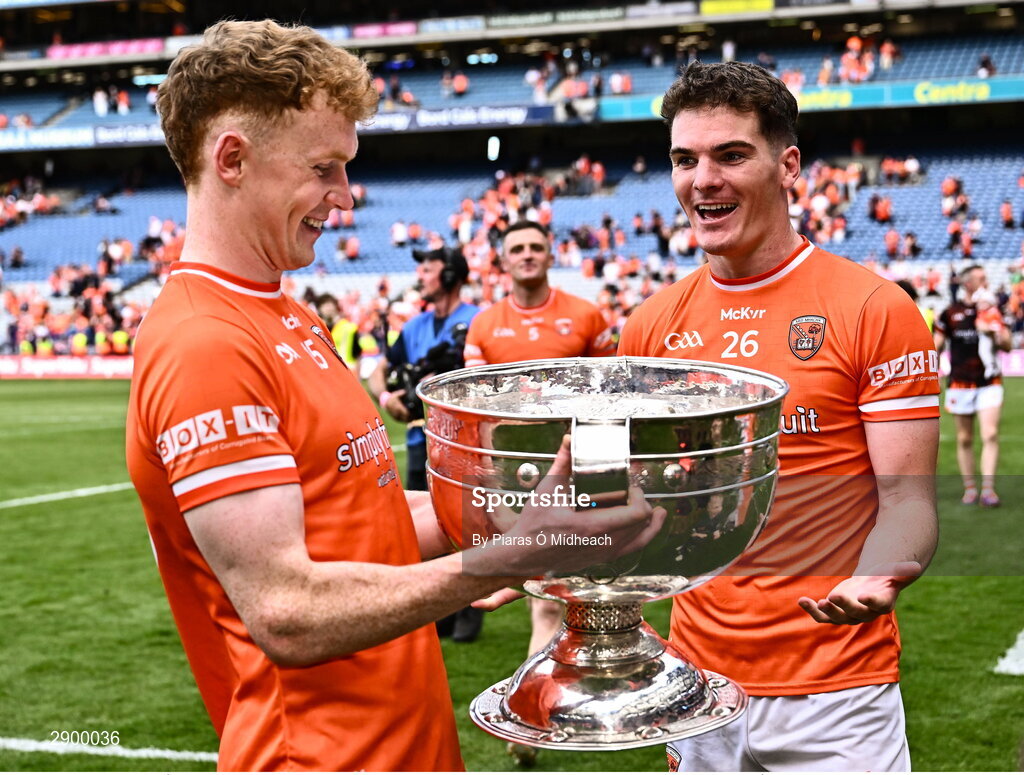 28 July 2024; Armagh players Jarly Óg Burns, right, and Conor Turbitt with the Sam Maguire Cup after the GAA Football All-Ireland Senior Championship Final match between Armagh and Galway at Croke Park in Dublin. Photo by Piaras Ó Mídheach/Sportsfile